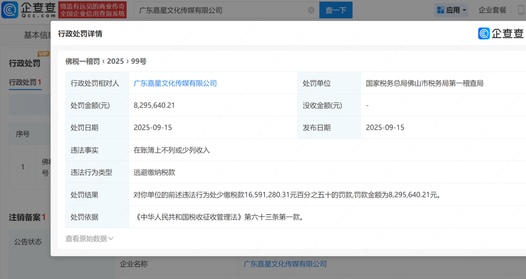 凭证网友提供的陈迹,被查处企业为广东嘉星文化传媒有限公司。查询企查查信息发现,被罚企业广东嘉星文化传媒有限公司于本年9月,因少缴税款1659万余元被国度税务总局佛山市税务局第一调查局罚金829.56万余元。